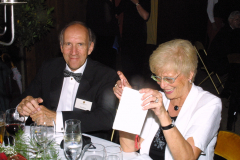 Was wäre ein Porschetreffen ohne den Damen die Gelegenheit zu geben, ihre Garderobe auszuführen. Wieder einmal war die festlich dekorierte Hofreitschule auf Schloß Wallerstein Treffpunkt von Glanz und Gloria. Elegante Abendroben bei den Damen der gehobenen Gesellschaft , bei den Herren der Schöpfung dominierten Smoking, Fliege, oder banal dunkler Anzug und Seidenkrawatten und ganz elegant Herr Lothar Neudert im Frack. Einen ungewohnten Anblick boten der „Ritter vom Nürburgring“, Rudi Philipp und Hans G. Engels die sich jeweils in dunklen, edlen Zwirn gekleidet hatten. Beide Herren sind aus Film, Funk und Presse besser bekannt, wenn Sie mit ihrer typischen GTP-Weekend-Sportswear-Kollektion (kann über die PCD Geschäftsstelle bestellt werden) als Herren der Rennstrecken über 40.000 Pferdestärken und mehr „regieren“. Getanzt wurde bis in den frühen Morgen nach den Klängen der Peter Ehringer Band vom Wiener Walzer, Tango Cha-Cha-Cha bis zum Schmusekurs.