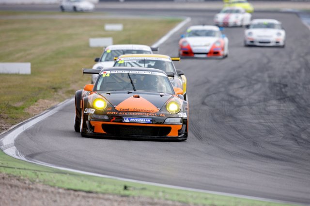Im ersten Lauf zum Sports Cup gab es einen Start/Ziel-Sieg des Empfingers Walter Schweikart. Dr. Raul Hille aus Hannover erwischte einen Bombenstart, machte gleich zwei Ränge gut und konnte sich an die zweite Position setzen. Die verteidigte er geschickt bis ins Ziel gegen den stark drängelnden Thomas Flügel. „Flügel war schneller, ich hätte ihn wohl auch vorbeigelassen, doch meine Kinder saßen auf der Tribüne“ grinste Dr. Hille im Ziel. Beim zweiten Rennen am Sonntag ließ er dann Flügel auch den Vortritt. Doch mehr als Position zwei war nicht drin für den groß gewachsenen Oldenburger, denn Walter Schweikart war erneut nicht zu schlagen. Alle drei waren auf Porsche 911 GT2 unterwegs.