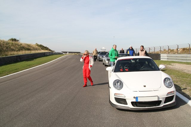 Beim Geführten Instruktions-Fahren, erklären die erfahrenen PCD Instruktoren den Teilnehmern über Funk die Eigenheiten der Strecke und zeigen die Ideallinie auf. Ziel ist es, das Fahrverhalten auf der ganzen Strecke zu üben und die eigene Ideallinie zu finden. Gerry Haag instruiert die blaue Gruppe mit einigen Teilnehmern, die das erste Mal in Zandvoort sind.