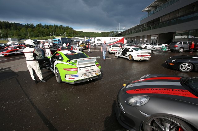 Während der Fahrerbesprechung am Nachmittag konnten – nur vom Platz des Referenten – durchs Fenster die schwarzen Wolken über der Remus Kurve und auch der einsetzende Stark-Regen “gesichtet” werden. Die Wertung der PCS-Challenge basiert auf einer Rundenzahl, die jeder Teilnehmer leicht erreichen kann. Eine Entscheidung musste her: Bei Regen können ca. 5 Runden weniger als im Trockenen gefahren werden.