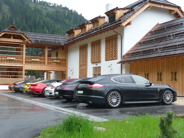 Dort war am Sonntagabend von Porsche Parade noch wenig zu spüren, aber am Mittwoch ging’s dann richtig los. Ab Mittag reihte sich ein Porsche an den anderen bei der Hotelanfahrt. Pfiffig war auch die “Garagen-Lösung”, hatte man doch das örtliche Eissport-Stadion kurzerhand zum Parkhaus umfunktioniert.