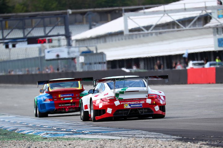 Beim Start zum zweiten Rennen spielte Vetter seine Leistung voll aus und bog vor Wolters in die Ravenol-Kurve ein. Indes kam Klaus Horn überhaupt nicht gut weg. Der Landauer fand sich nach der ersten Runde nur an der sechsten Gesamtposition wieder. An der Spitze entbrannte ein packender Zweikampf. Die Vorentscheidung fiel in Runde elf, als Wolters mit viel Schwung durchs Kiesbett Eingangs Motodrom rodelte. Dadurch bekam Vetter genügend Luft, um mit knapp über fünf Sekunden Vorsprung seinen ersten Gesamtsieg einzufahren. „Das war ein brutales Rennen. Normalerweise kannst du den Heinz-Bert Wolters nicht halten. Zum Glück konnte ich in der ersten Kurve gleich in Führung gehen. Aus den Kurven heraus ist der GT3 R abartig. Es ist wichtig, dass ich da gerade stehe und meine Power ausspiele. Auf den Geraden hatte ich unterschiedliche Abstände herausfahren können, aber er war immer wieder da. Heute habe ich Glück gehabt, denn normalerweise ist das Auto in der Serie nicht zu schlagen“, erklärte Vetter.