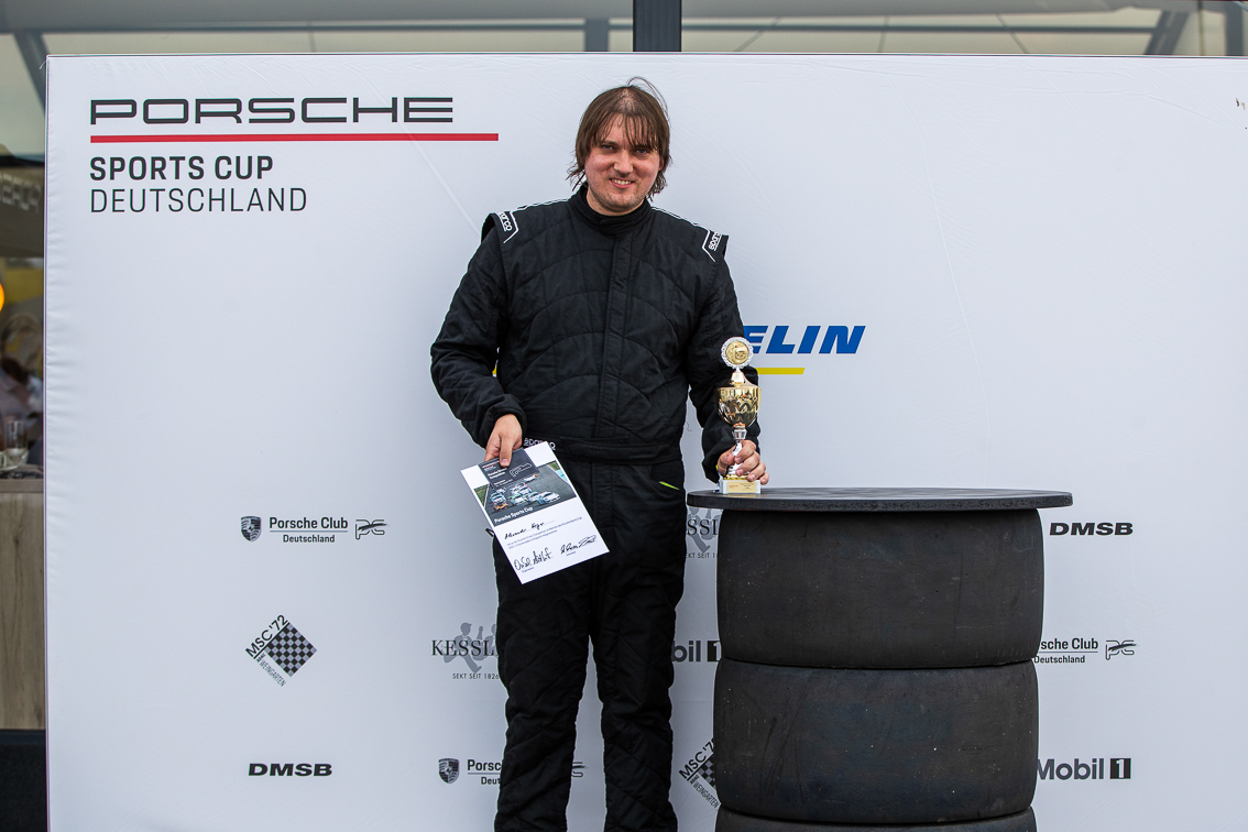 In der Porsche Sprint GT zeigte Lorenz Stegmann (Cayman GT4 Clubsport) erneut, was in ihm steckt. Von der Pole Position gestartet, musste das Talent Wilhelm Lathus (991 GT2 RS) nur kurz passieren lassen. Bereits nach drei Kurven setzte er sich erneut an die Spitze und führte das Feld mit komfortablem Vorsprung an. „Ich konnte mich am Start durchsetzen und dann die Stärken des Cayman GT4 Clubsport ausspielen. Mit seiner Wendigkeit funktioniert das Auto gerade in den engen Kurven sehr gut. So habe ich meine Linie gehalten und mit der Zeit einen guten Vorsprung herausgefahren“, berichtete Stegmann nach seiner cleveren Fahrt. Bei der Ehrung der bestplatzierten Cayman Piloten feierten Mariusz Gorecki (Förch Racing) und Maiko Dufner (KÜS Team Bernhard) die Plätze zwei und drei. In den Reihen der besten straßenzugelassenen Porsche Fahrzeuge versammelten sich am Sonntag bekannte Namen, tauschten jedoch die Plätze. Auf Lathus folgte „Manolo“ (991 GT3 RS), der am Samstag drittbester Starter mit Straßenbereifung wurde. Felix Neuhofer (991 GT3 RS) nahm am Sonntag den Pokal für den dritten Platz entgegen. In der übergreifenden Gesamtwertung der Porsche Sprint GT liegt „Manolo“ weiter auf Platz eins. Seine schärfsten Verfolger sind derzeit Stegmann und Lukas Drost (991 GT3).