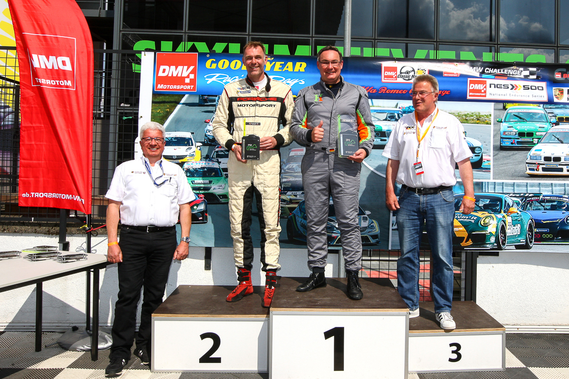 Platz zwei sicherte sich im ersten Rennen Klaus Horn. Der Landauer musste sich dabei den ständigen Attacken von Heinz-Bert Wolters erwehren. Trotz mehrerer Versuche hieß es für Wolters sich am Ende mit Rang drei zufrieden zu geben. „Im Großen und Ganzen bin ich eigentlich zufrieden. Am Anfang kam ich ganz gut weg. Aber vorne fuhr Peter Mamerow so eine Sekunde schneller und da konnte ich nicht hinkommen. Von hinten machte Heinz-Bert Wolters mächtig Druck. Beim Überrunden hatte ich etwas Pech und Wolters konnte wieder aufschließen. Letztendlich konnte ich ihn in Schach halten“, so Klaus Horn. Mit seinem dritten Platz zeigte sich auch Wolters zufrieden: „Bis auf den Ausrutscher, den ich mir geleistet habe, bin ich sehr zufrieden. Zumal ich ein technisches Handicap habe. Bei 8500 riegelt das Auto ab und nicht wie sonst bei 9200. Da wurde vermutlich etwas falsch eingestellt, als der Wagen bei Porsche war. Ich denke, dass ich das Beste daraus gemacht habe.“