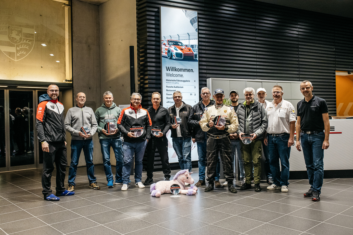 Die aufgestellten Ehrenpreise erregten schon am Nachmittag das besondere Interesse der Fahrer, die eigenwillige runde Form und die eingebaute Beleuchtung sorgten für Begeisterung. Mirco Struck und Falco Bethke hießen die Gesamtsieger der PCD Taycan-Competition 2023 vor dem für den PC Rhein-Main startenden Single-Driver Stefan Wagner. Rolf Blaeß mit Co Sebastian Pratz kam auf Platz 3 vor dem Kirchen-Hausener Dream Team Lothar Denzel und Thomas Maier. Andreas Smykalla, Geschäftsführer des PZ Magdeburg mit seinem Co Alexander Schöbel konnte einen Klassensieg mit ins PZ Magdeburg nehmen. Für das Familien-Team um Dr. Jörg Pfisterer vom PC Köln gab es einen vielbeachteten 4. Platz. Die für das PZ Reutlingen startende Rebecca Rein durfte nun einen der schönen Ehrenpreise für den 3. Platz ihres Teams (Rein-Schmitz-Gabler) mit nach Hause nehmen, sie verwiesen ihre Teamkollegen auf den 4. Platz (Seip-Frauendiener). Christian Striepen, Präsident PC Wuppertal mit seinem Co Thorsten Hesmert, reihten sich nach einem Defekt kurz vor Ende mit Platz 5 hinter dem Wuppertaler Team Frank Alfter, Peter und Filip Kron sowie dem Magdeburger Team Robert Peters, Mathias Hrabia und Andreas Shapes ein. Nach einem kräftigen Applaus für die Organisation gab es ein Versprechen im nächsten Jahr diese wirklich einzigartige Veranstaltung wieder zu besuchen.