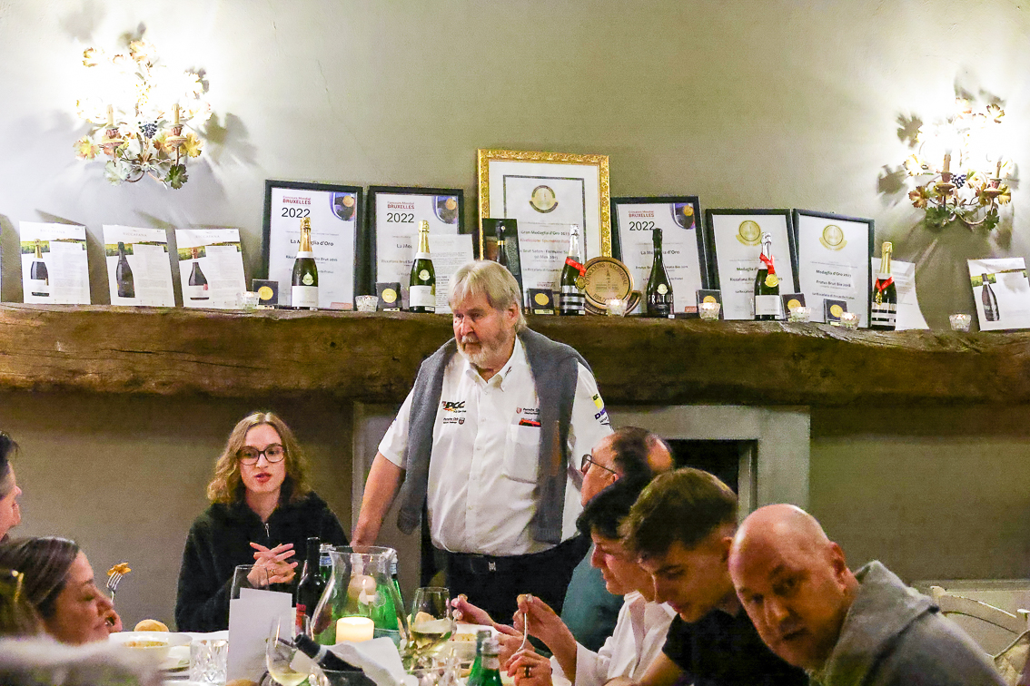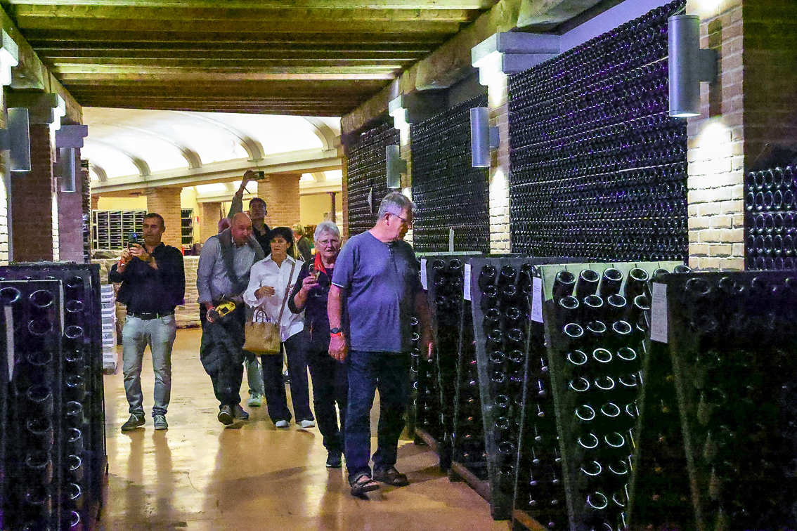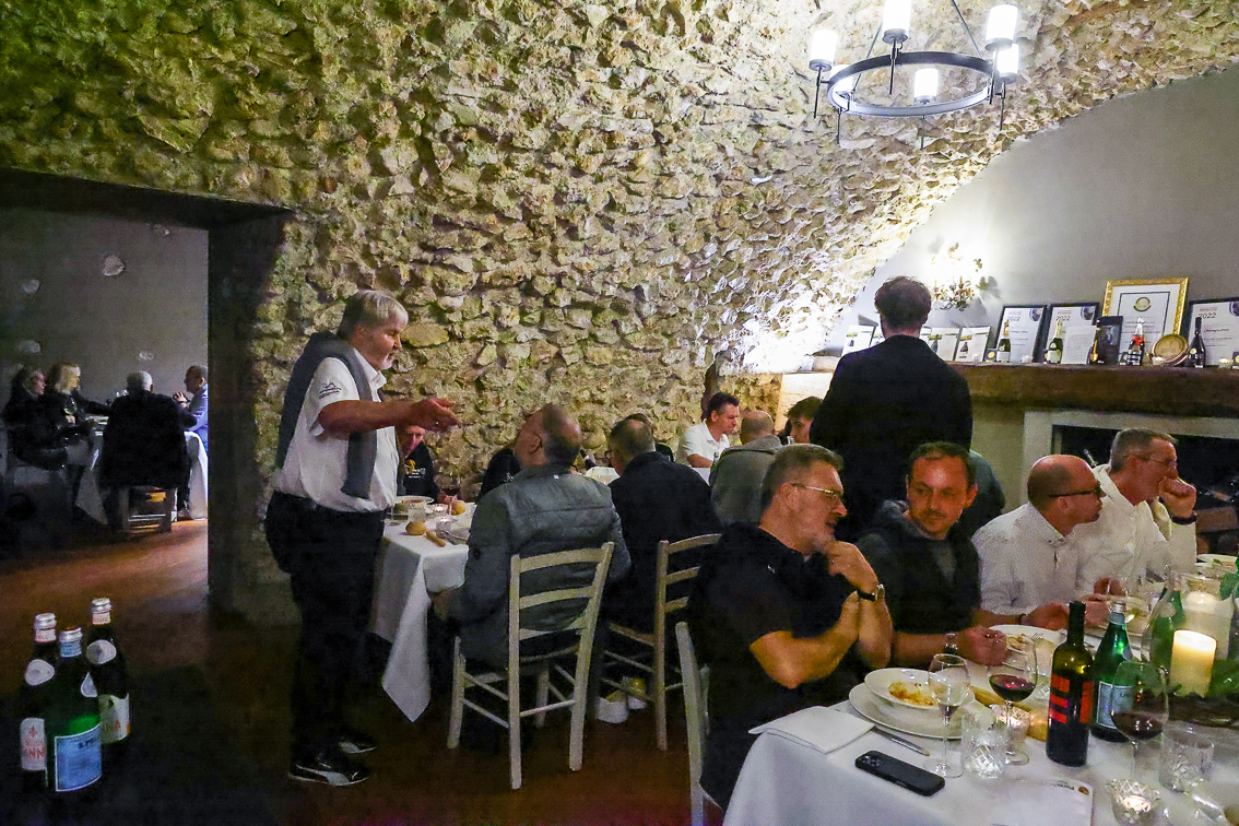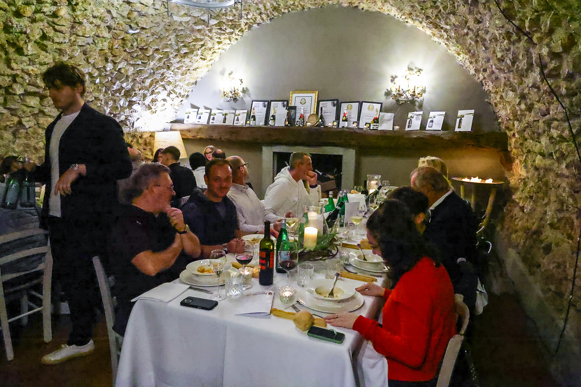 Gerry hatte auch für seine Ladies einen Ehrenpreis und lobte dabei die Fortschritte und die gute Stimmung den Tag über. Nach der Siegerehrung in den Boxen hieß es eiligst zurück ins Hotel, denn um 19 Uhr wartete bereits der Bus, der uns in eines der ältesten Weingüter Franciacortas das Riccafana brachte. Vor dem im Familienbesitz von Francesco’s Familie befindlichen Weingut wurden wir bereits zu einer spannenden Führung erwartet. Francesco ließ es sich nicht nehmen und führte uns selbst gekonnt und souverän durch die Keller. Eines der Höhepunkte ist das wirklich einmalige Fingerfood, das zur Probe der edlen Franciacorta (nach Champagner-Art hergestellt) gereicht wurde. Michael nutze die Stille um sich mit einem originellen beleuchten Ehrenpreis bei Francesco zu bedanken. Danke für 10 Jahre enge Zusammenarbeit ohne Verträge- Vertrauen gegen Vertrauen. So wurde als Beispiel das gesamte Hotel ab Februar für die Porsche Tage aus dem Netz genommen und nur der PCD vergab die Zimmer. Einmalig! Die Freude über die Ehrung war Francesco anzusehen, Seine Dankesworte waren emotional. Als ob dies nicht schon genug wäre, rief uns Francesco in die Arcaden des Weingutes, ein serviertes typisch italienisches Menü wurde uns serviert, dazu das Beste aus dem Keller in Rot und Weiß, ausgesuchte Riccafana Weine.