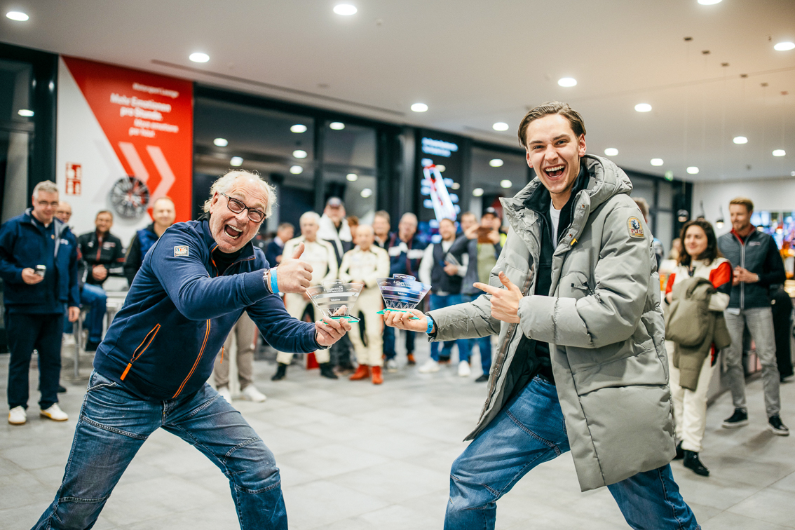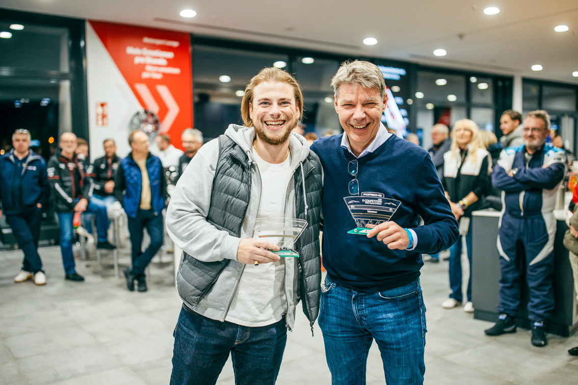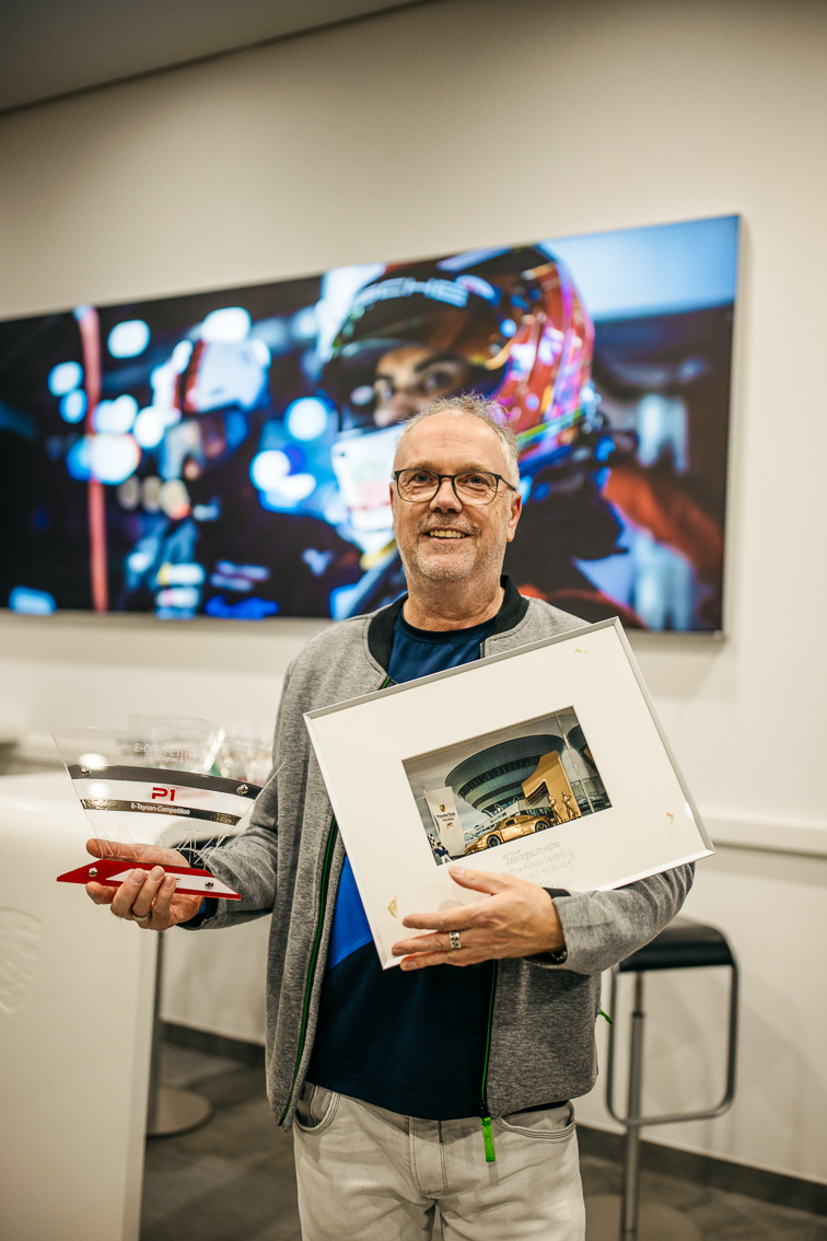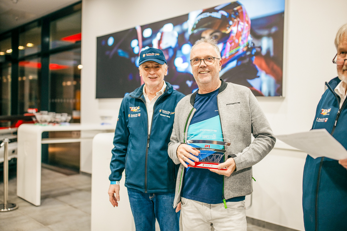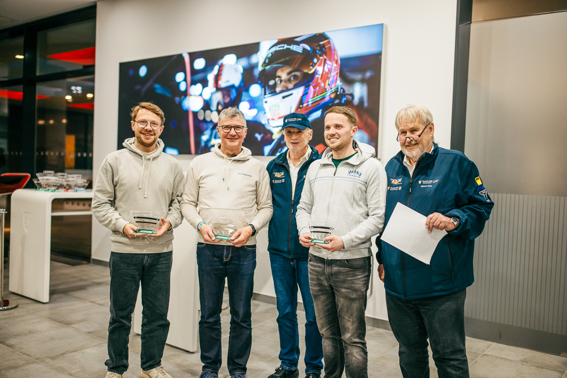 Das Bistro füllte sich und nur 15 Minuten später konnten Gerry und Michael mit der Ehrung der Sieger beginnen. Nach einem herzlichen Dankeschön an Jörg Menzer von Porsche Leipzig und unseren Supervisor, sowie an unser Dream-Zeitnahme-Team Christoph und Moni (sagt man als Kavalier nicht: Moni und Christoph?) Wir haben festgestellt, dass der Taycan gen. 2 überragend bessere Ladezeiten und Effizienz bietet, weshalb wir die 3 Taycan gen. 1 in einer eigenen Klasse gewertet haben, ebenso natürlich die 5 gestarteten MACAN. Dort siegten die für den PC Schwaben gestarteten Rolf Blaeß/Gerry Haag deutlich vor dem Wuppertaler Macan mit Joest/Michael/Baguena-Ellers und dem Team Bischoff/Bischoff, die auf Platz 3 landeten. In der Klasse Taycan 1 siegte souverän der allein fahrende Torsten Klotzsch-Fiehn vor dem Team Patrick Lorbeer und Kevin Tesch, sowie dem auf dem 3. Platz gelandeten Stefan Wagner vom PC Rhein-Main. Torsten beendete schon 2-mal die Competition als Gesamtsieger, weshalb es Michael für angebracht hielt, genau Ihm den nicht verwendeten Gesamtsiegerpreis aus 2024, eine edle individuelle „Pfeffer-Box“ des Künstlers Klaus Pfeffer zu überreichen. In der großen Klasse der Taycan 2.gen kam das PZ Magdeburg mit Andreas Smykalla/Alexander Schöbel auf den 5. Platz. Groß war meine Freude dem „Family-Team“ Wiedmann mit Jürgen, Yessica und Antje die Pokale für den 4. Platz überreichen zu dürfen. Das gemischte Team aus PC Wuppertal und PC Rhein Main war eine Klasse für sich, Teamchef Frank Alfter hat mit Anke Lawenstein einen Trumpf gezogen und mit Hartmut Fischer einen weiteren coolen 3. Mann angeheuert. Das Dream Team aus dem PCD Club Cup- Thomas Maier und Lothar Denzel, beide PC Schwaben, verpassten den Gesamtsieg nur um wenige hundert Meter. Das Newcomer Team des PC Wuppertal Neubecker/Neubecker und Torsten Schaub fuhren einen knappen Gesamtsieg nach Hause und konnten den Gesamtsieger Pokal mit Beleuchtung in Empfang nehmen. Alle waren sich einig, sehr spannende 2 Tage mit viel Spaß und knackigem E Motorsport machen Lust auf M E H R.