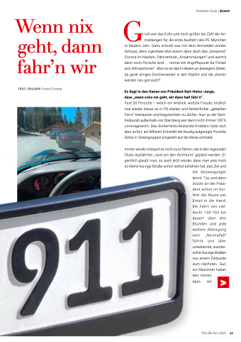 Schluss, denn irgendwie sitzt einem dann doch das „Gespenst“ Corona im Nacken. Fahrverbote, „Ansammlungen“ und wenn’s dann noch Porsche sind... Immer ein Angriffspunkt für Polizei und „Klimaschoner“. Aber so ist das in diesen un-bewegten Zeiten, da gerät einiges Durcheinander in den Köpfen und die „Karten werden neu gemischt“.